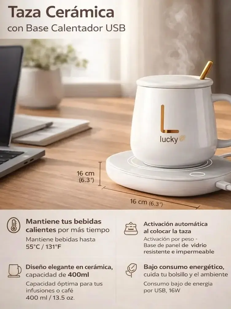 Disfrutá de tus bebidas calientes por más tiempo con esta taza de cerámica acompañada de una base calentadora con conexión USB. Está pensada para mantener café, té o infusiones a una temperatura agradable mientras trabajás o descansás, sin necesidad de recalentarlas constantemente. La base se activa al colocar la taza encima y ayuda a conservar el calor de forma constante. Su diseño blanco, simple y prolijo, combina fácilmente con cualquier escritorio, oficina o ambiente del hogar. Es una opción práctica para el uso diario, especialmente en jornadas largas frente a la computadora.